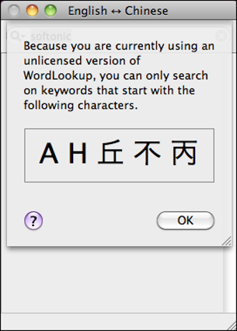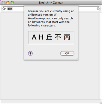 WordLookup is op zich een handig programma, ware het niet dat deze probeerversie ontzettend beperkt is. Het programma staat je alleen toe termen te zoeken die beginnen met een A, H en een drietal niet-Westerse karakters.
